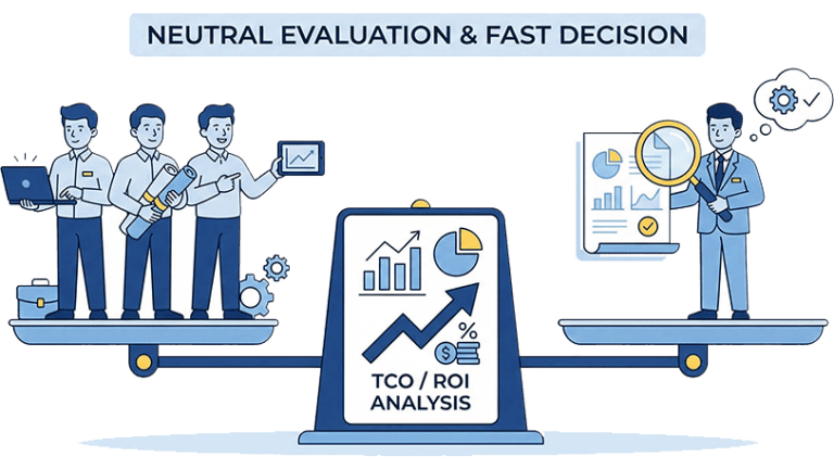 A strong evaluation looks forward. It’s easy to find a tool that fits today; the hard part is choosing a system that supports where you’re going. We anchor the evaluation in your next 3-5 years growth, markets, products, compliance, and an IT landscape that must scale then back propagate to processes and requirements your future demands.