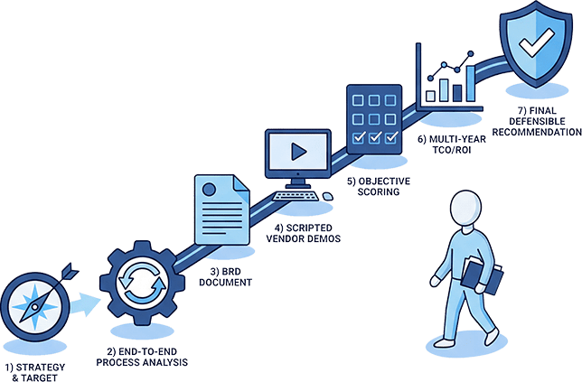 Start at any point. We're flexible and can plug into your journey, pre-evaluation, during vendor comparisons, or as a neutral advisor in implementation.